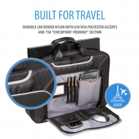 Designed in compliance with TSA guidelines so your laptop does not need to be removed when passing through airport security, the Elite Toploader Laptop Case is the perfect solution for convenient travel. Durable and professional, the laptop case has a padded computer compartment that fits most 16" laptops. Workstation has ample room for storage and includes a key clip, three pen loops, two netted accessory pockets, cell phone pocket, gusseted business card holder and a separate file section. Read more about 16" Elite Top load Carrying Case IM-04